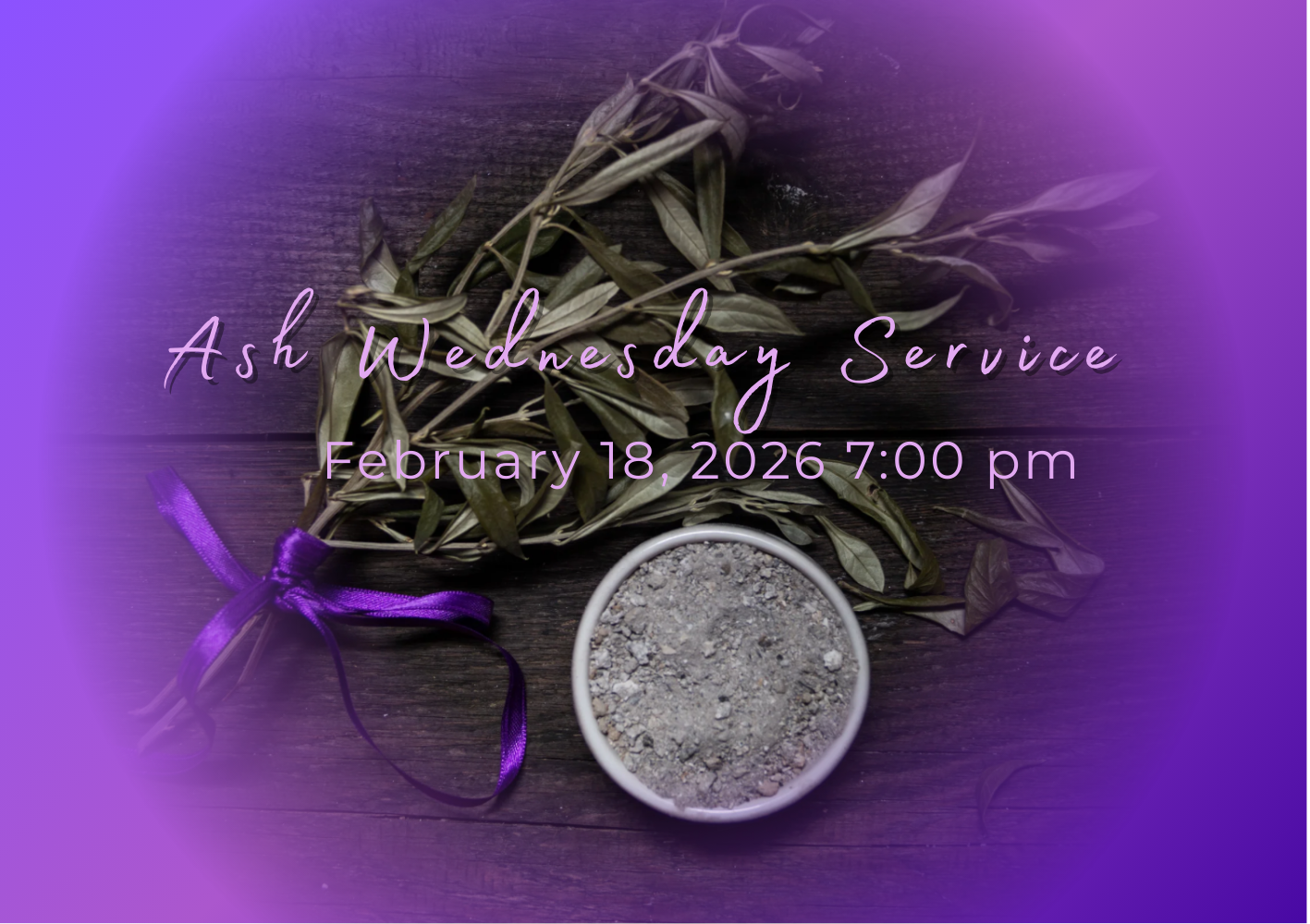 Join us for a reflective Ash Wednesday worship service as we begin the season of Lent. The service will include prayer, scripture, and the imposition of ashes, inviting us into a time of repentance, reflection, and renewal. All are welcome.