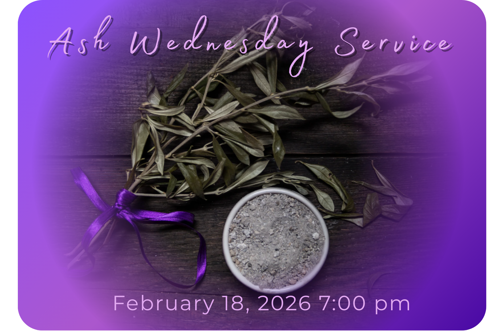 Join us for a reflective Ash Wednesday worship service as we begin the season of Lent. The service will include prayer, scripture, and the imposition of ashes, inviting us into a time of repentance, reflection, and renewal. All are welcome.